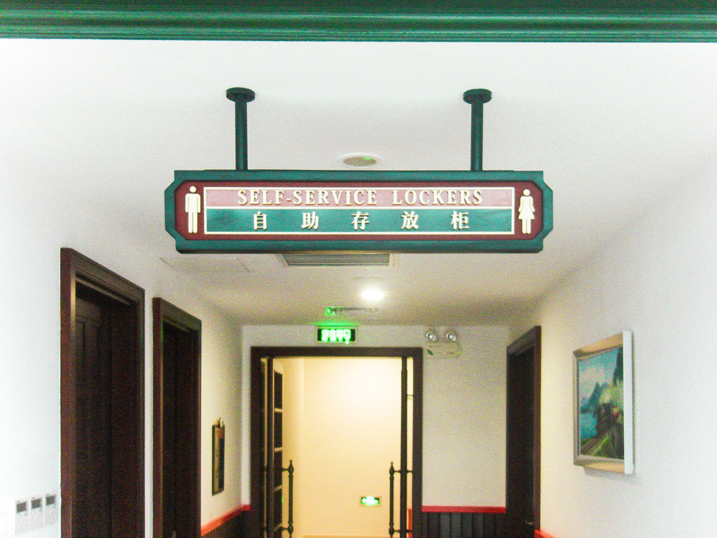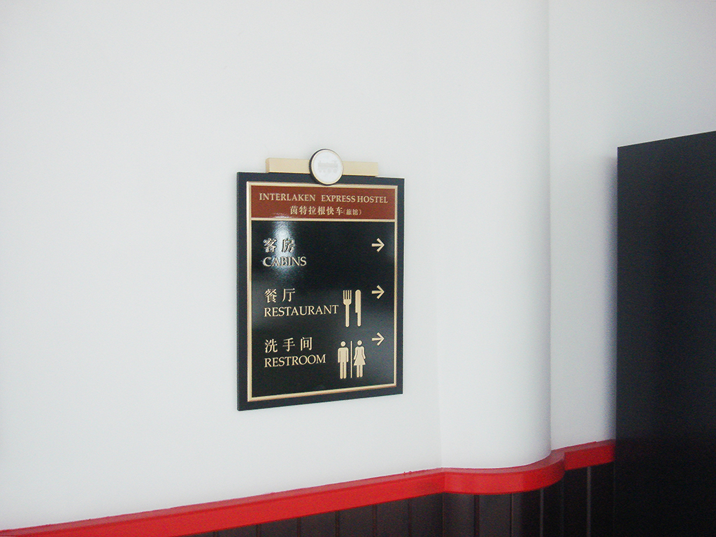 用的色彩古朴与快车旅馆建筑装饰所运用的色彩搭配协调.利用钢及电解板材料,通过雕刻丝印,LED灯等加工技术,形成快车旅馆环境