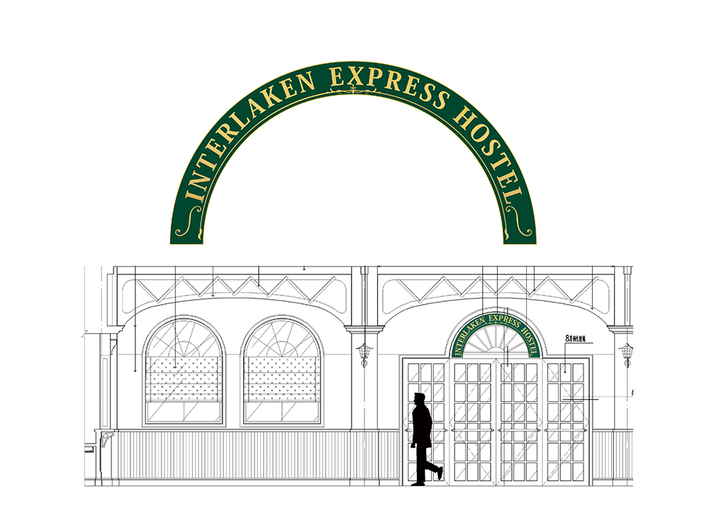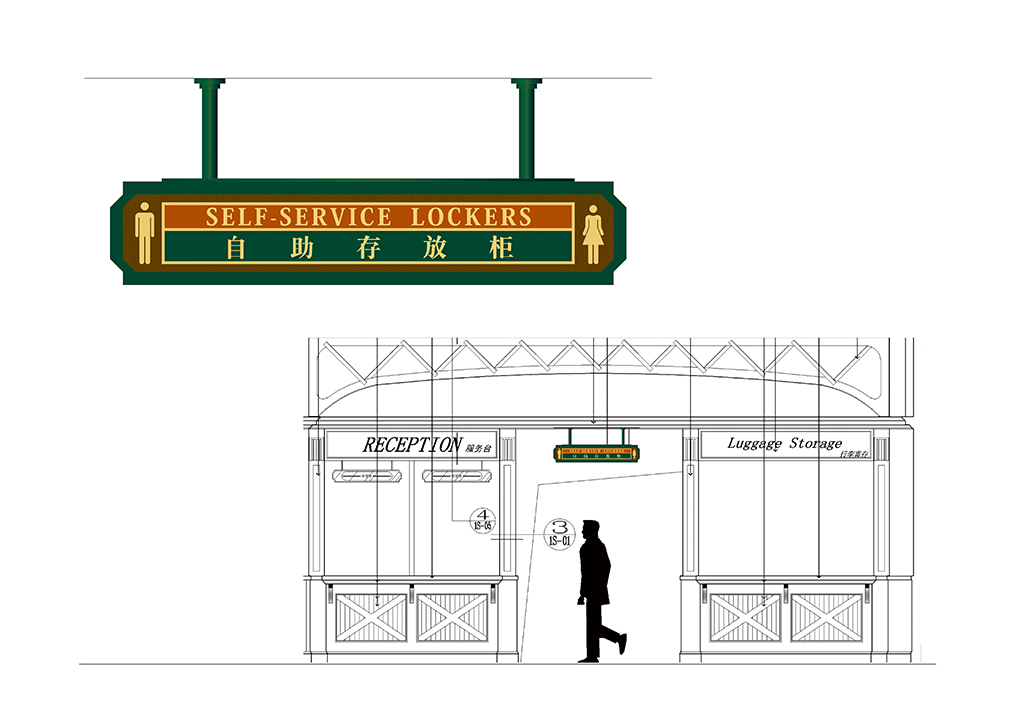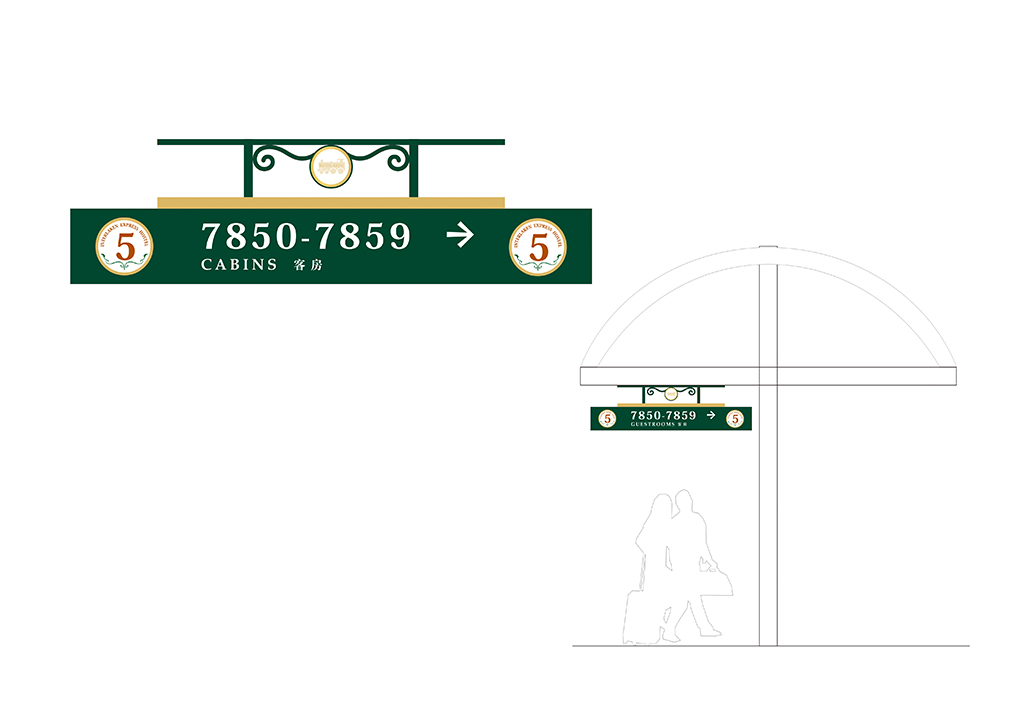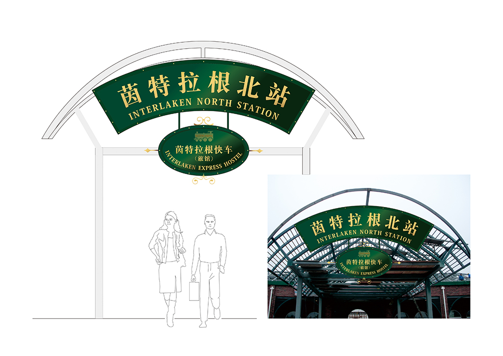的欧洲小镇为背景.加以火车图形元素为导示传达火车主题酒店的讯信.导示系统的设计概念体现快车旅馆的设计主题.导示系统中运